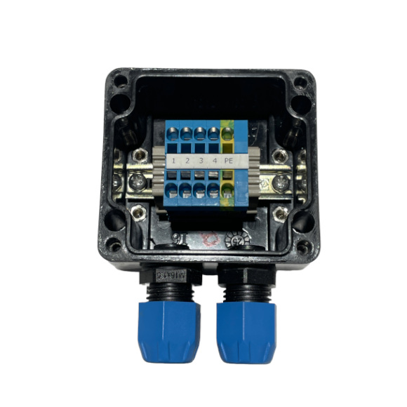 The box includes 2 cable entries with blue polyamide glands M16x1.5 and is equipped with 4 2.5mm2 blue terminals + 1 earth terminal.
